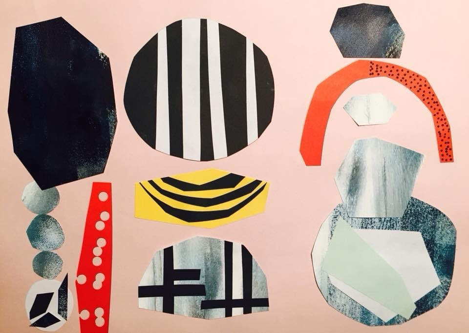 verkauft! FILIPPA: Collage A3, schwarz/ offwhite/ warmblau/ kaltblau/ warmgrün kaltgrün/ orange/ rot/ lachs