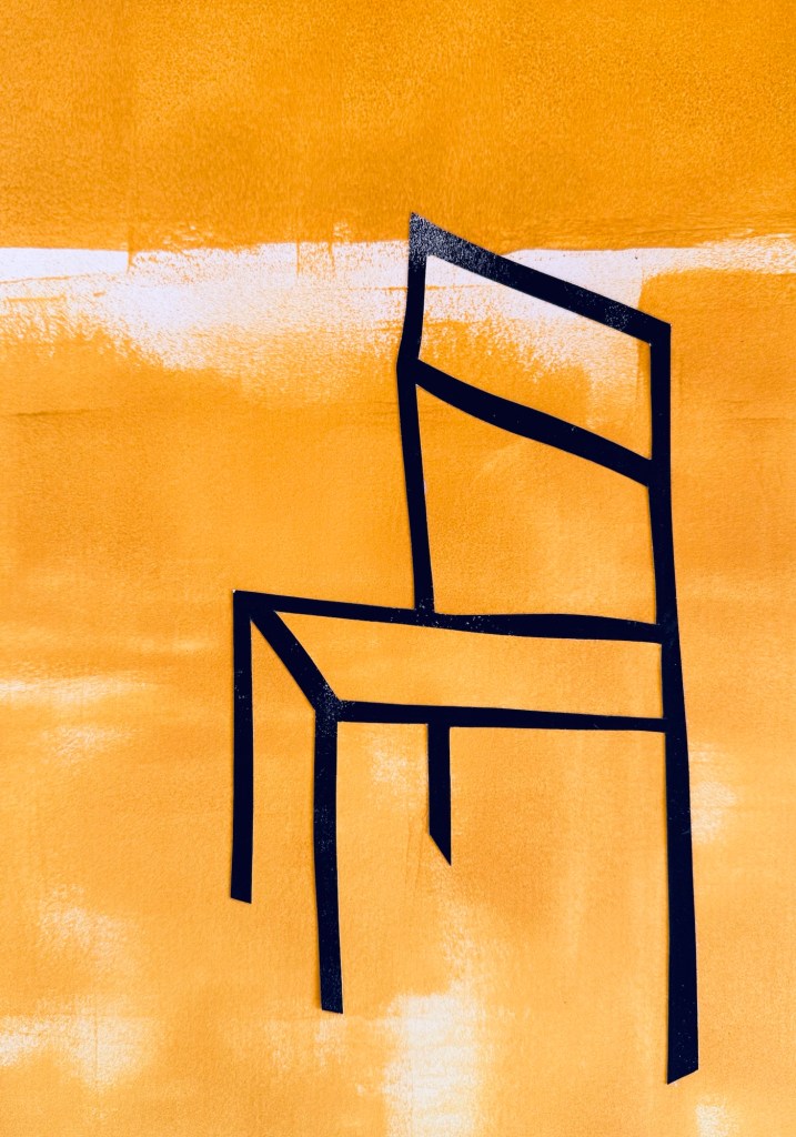 PRIVAT/STUHL: A4, Scherenschnitt, schwarz auf okker