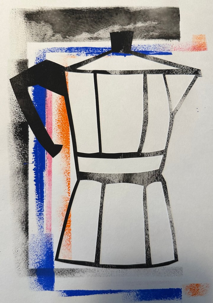 verkauft! Kaffee: Scherenschnitt, A4, schwarz auf sattblau, rosa, orange