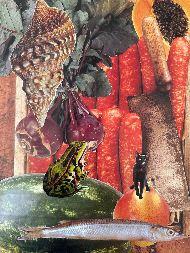 Ich bin fasziniert von Farben und deren Wirkung, mag meinen Farbsinn und den Mut, Buntes aber stets Schlichtes zu gestalten. Ich zeichne planlos, zerschneide, bemale spontan und setze die Teile wieder zusammen. So entstehen meine Collagen. Dadurch gibt es oft kleine Schönheitsfehler, denn ganz genau passt nichts mehr nebeneinander. Neuerdings ergänzen Scherenschnitte mein Collagensortiment: Filigran ausgeschnittene Bildskelette werden auf passenden Hintergrund gelegt. Jedes Bild ist ein Unikat, keine Drucke. Alle Bilder sind gerahmt, meist mit Masspasspartout.