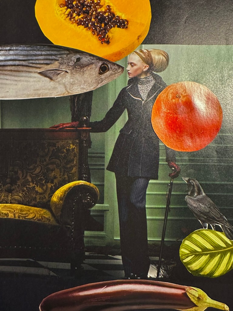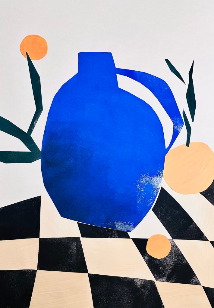 BLAUER KRUG MIT MANDARINEN: A2 Collage/ sattblau, schwarz, beige, pastellorange, tannengrün, offwhite, chf 780.-