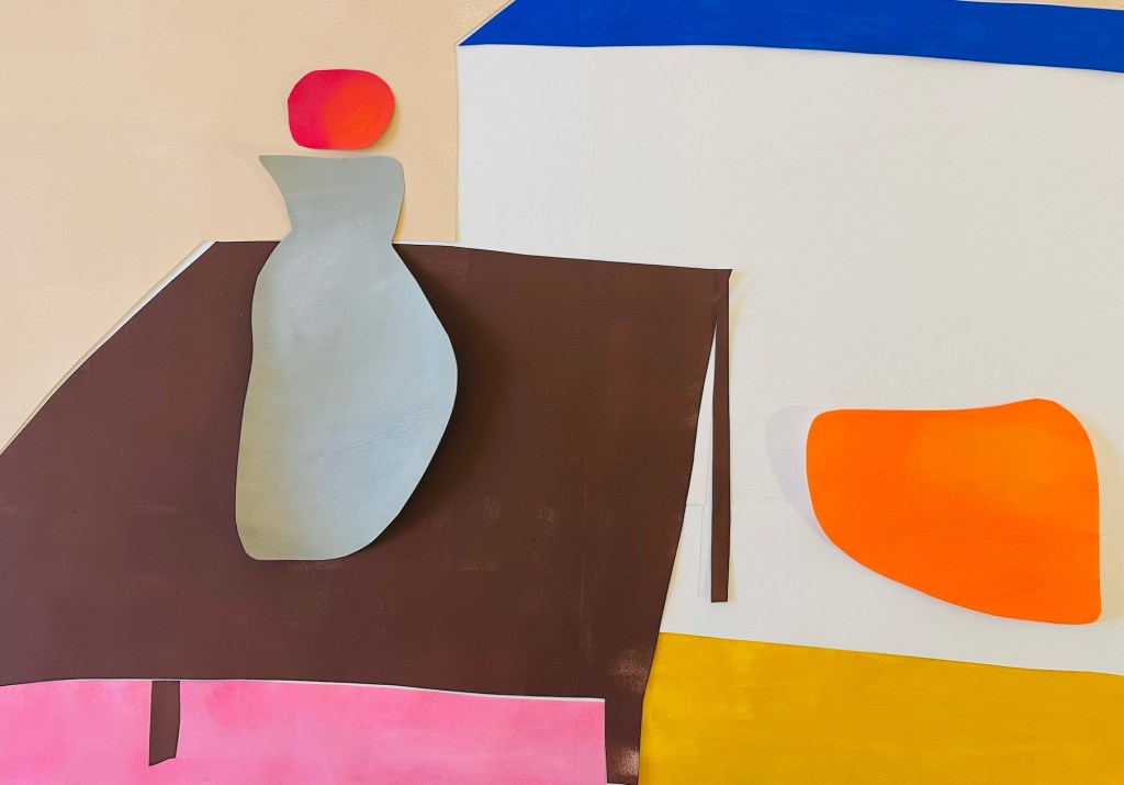 • BLAUER KRUG MIT MANDARINEN: A2 Collage/ sattblau, schwarz, beige, pastellorange, tannengrün, offwhite, chf 780.-
